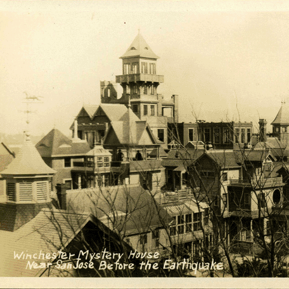 House is officially marketed as the Winchester Mystery House. Postcards are created by Frasher Fotos.