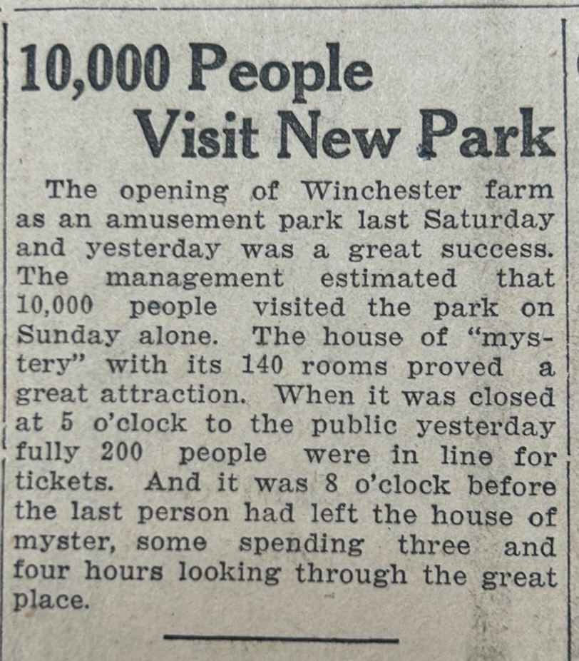 The Mansion is opened for public tours. Mayme Brown is the first tour guide. Sarah Winchester’s old gardens become “Winchester Park” where families can come and picnic and enjoy themselves. Around 10,000 people showed up on opening day to get a view inside of Sarah's mansion.