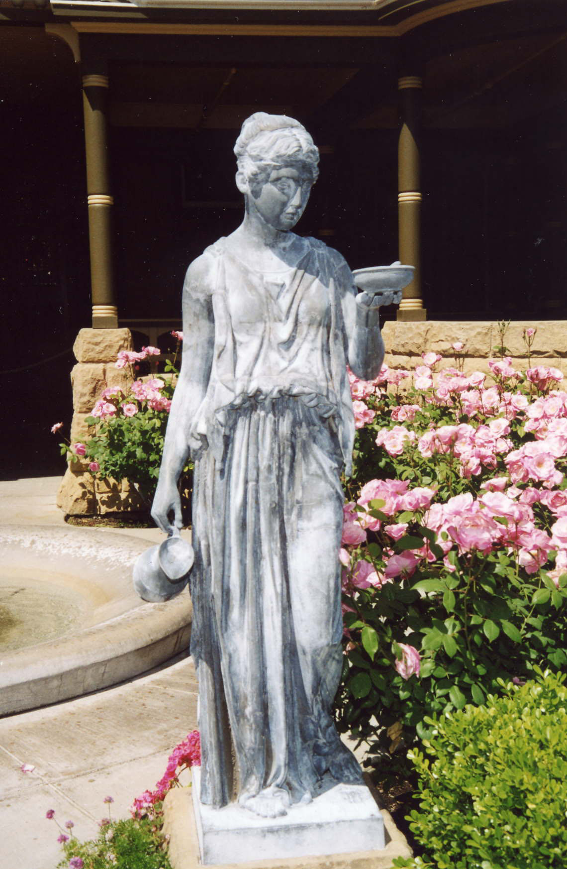 The classical statue of the goddess Hebe –one of a pair that flanked the Mansion entrance in Sarah Winchester’s time–is repaired and returned to its proper place in the gardens after a 60-year absence.
