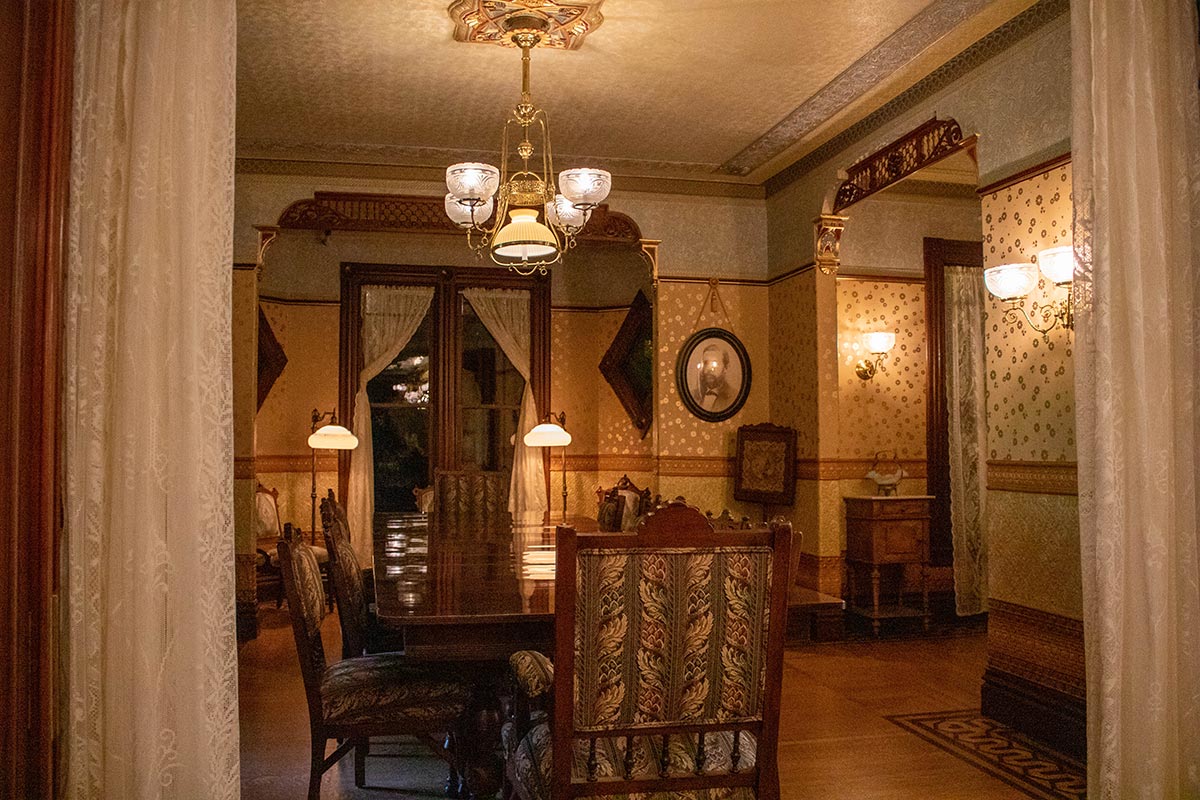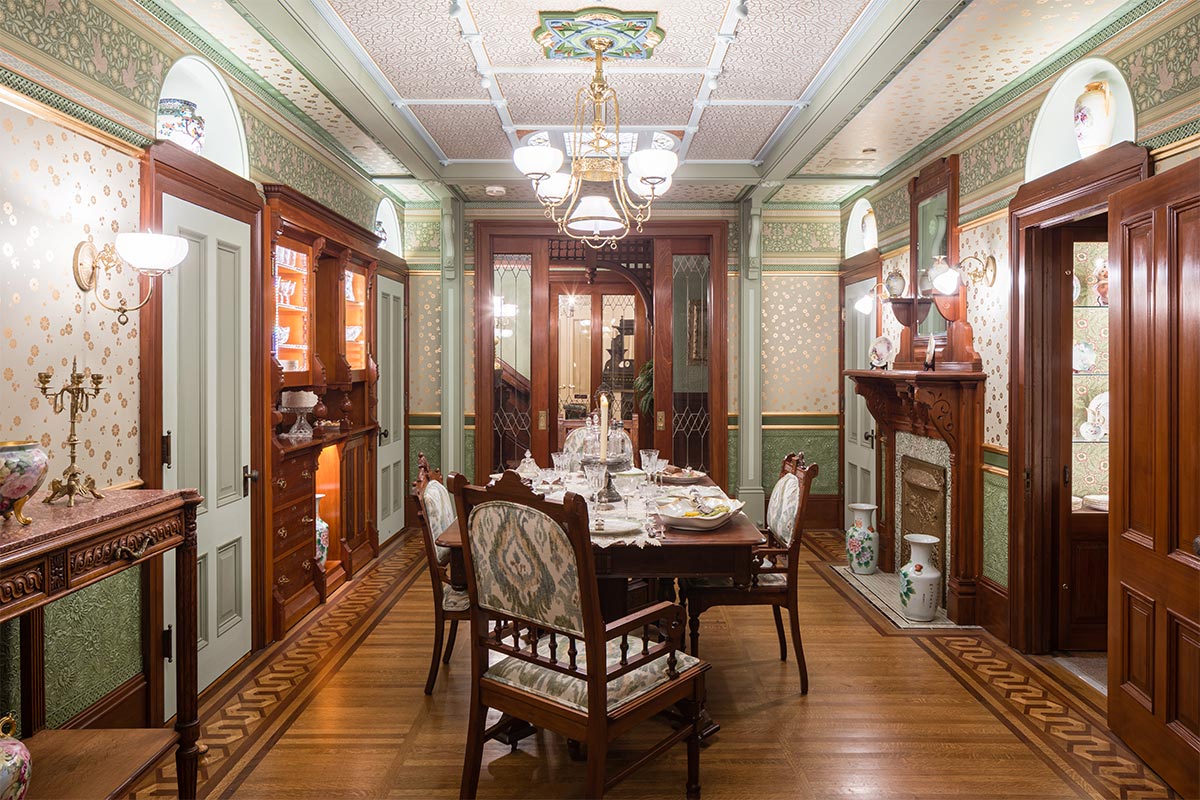 The North Twin Dining Room is restored, using 130-year-old wallpaper from Sarah Winchester’s stockpile, as well as new pieces made from molds of the old patterns.