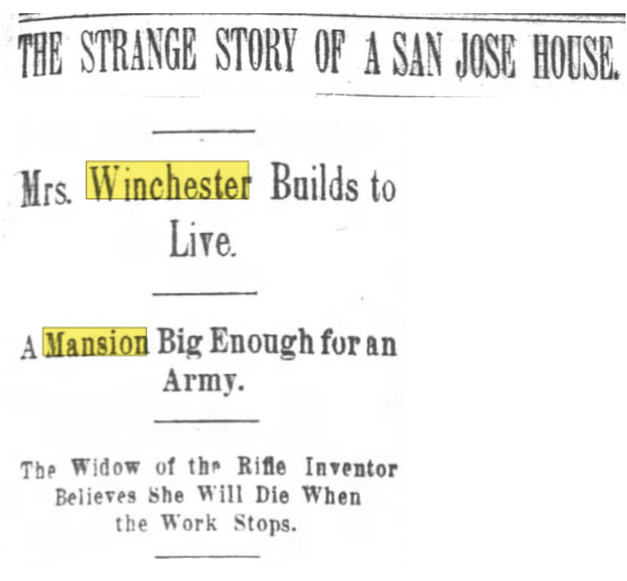 June 10, 1911 – The San Francisco Examiner publishes an article calling the mansion a “House of Mystery”. This was during Sarah Winchester’s time living in the home and long before it was ever known as the Winchester Mystery House.