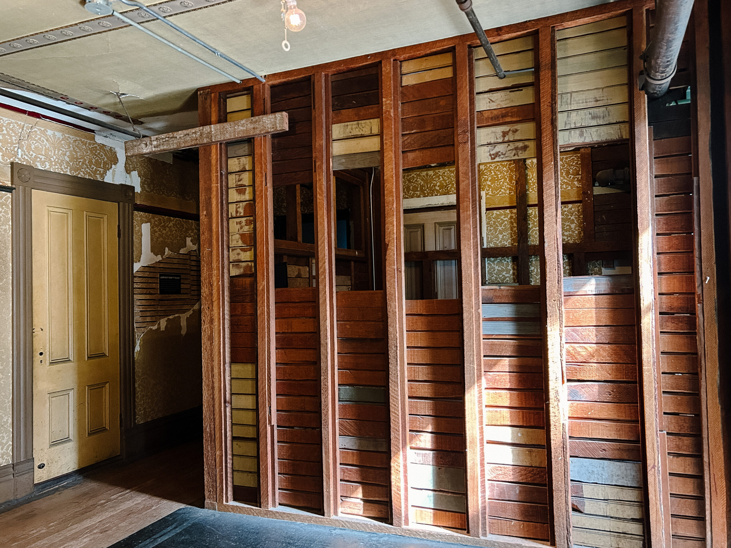 Re-purposed lumber was used by Sarah’s carpenters to build new bathroom walls in the Crystal Bedroom Suite.